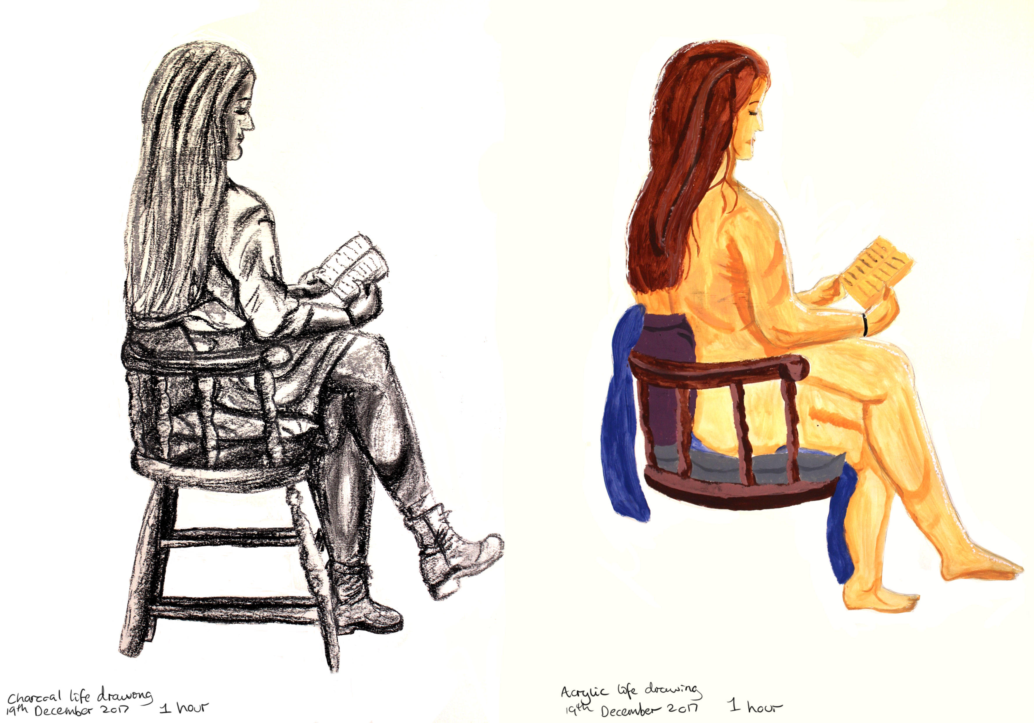 Life Drawings using Charcoal (left) and Acrylic Paint (right)